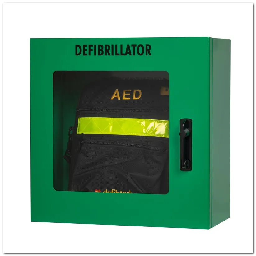 Defibtech AED Schutzschrank aus Stahlblech mit Alarmfunktion. Robuste Lösung für sichere Aufbewahrung und schnelle Verfügbarkeit im Notfall.